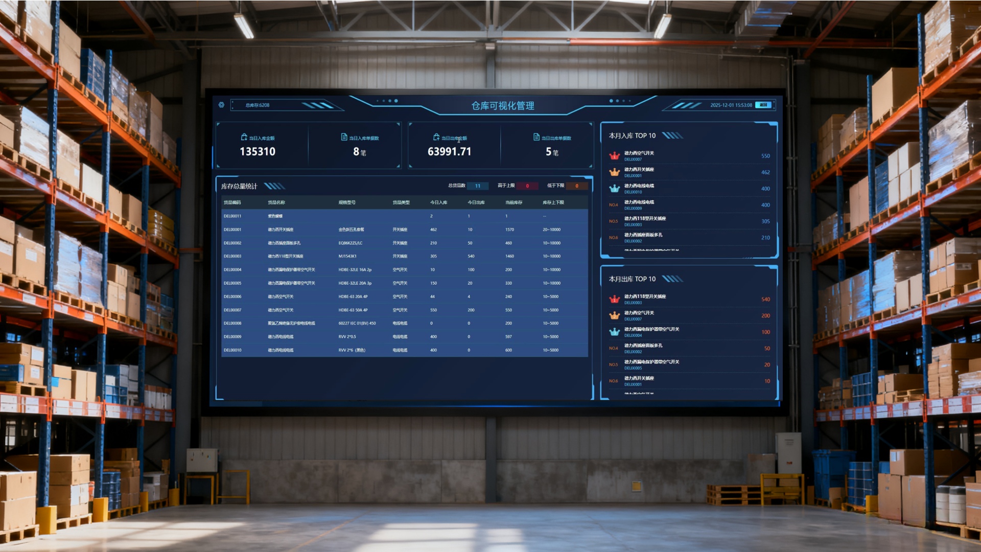 仓库大屏监控:适配仓库中控室大屏,支持物料库存数据实时滚动播放,库区货位分布、库存异常等信息一屏掌握,方便现场管理人员随时把控仓储状态;